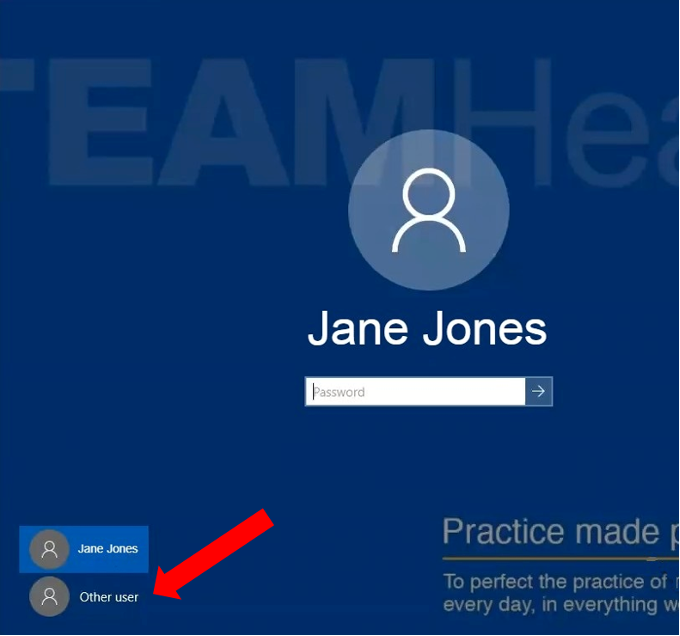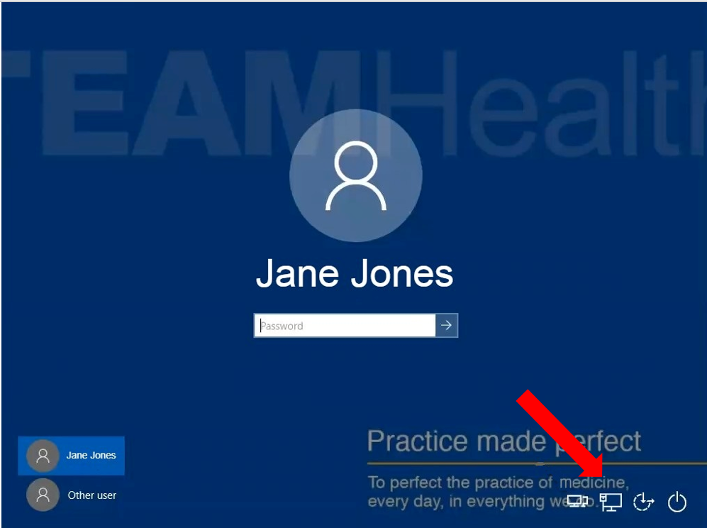 After starting your TeamHealth computer, you will automatically be taken to the Windows login screen. Follow these steps to connect to the TeamHealth network for the first time when working remotely.