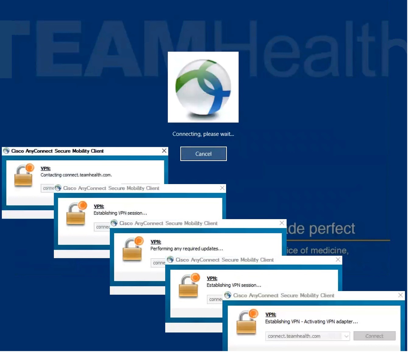 Cisco AnyConnect is software TeamHealth uses to allow employees outside of a TeamHealth office to connect their TeamHealth-owned computer to internal resources using a VPN.