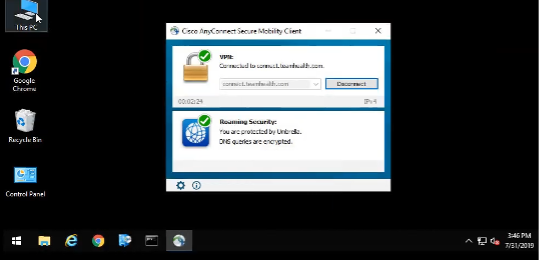 Once you have successfully signed in, you will be taken to your Desktop screen. You can close the Cisco popup, and work as expected. All drive mappings, login scripts, etc., will be present and perform as they would in a TeamHealth office.