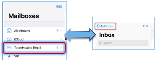 Step 22: Under Mailboxes on the left side of your mobile device, choose TeamHealth-Email (for adminreg accounts) or Teamhealth-Message Center (for docreg accounts).