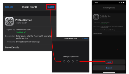 Step 17: From the “Install Profile” window, select Install in the top right corner. If you have a phone/tablet passcode, you will be prompted to enter the passcode to proceed.