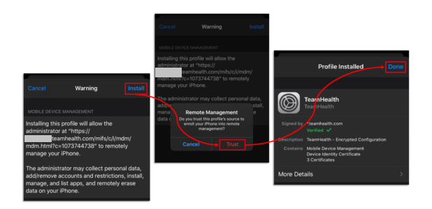 For “Remote Management”, select Trust to continue enrolling your device, and choose Done, when the profile installation has been completed.