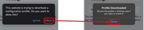 Step 14: Choose Allow to download configuration profile. Once complete, select Close on the “Profile Downloaded” pop-up.