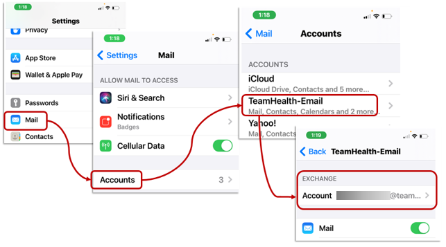 Step 19: Go back to the Settings Menu. Select Mail, then Accounts, then TeamHealth-Email (for adminreg accounts) or Teamhealth-Message Center (for docreg accounts).