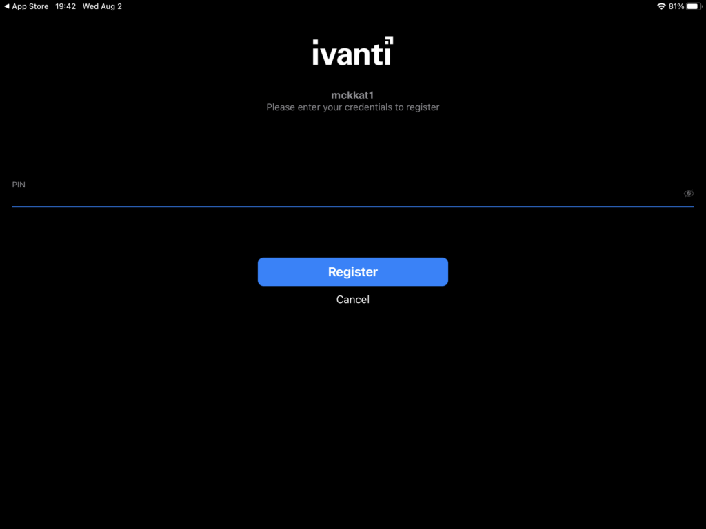 Step 12: In the PIN field, enter the Registration PIN obtained in Step 6, then tap Next on the keypad or the blue Register button.