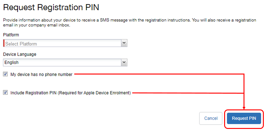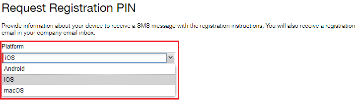 Step 4: On the “Request Registration PIN” form, choose the appropriate Platform for the mobile device on which you will install MobileIron.