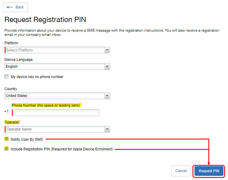 Check the boxes for “Notify User by SMS” and “Include Registration PIN”, then click Request PIN
