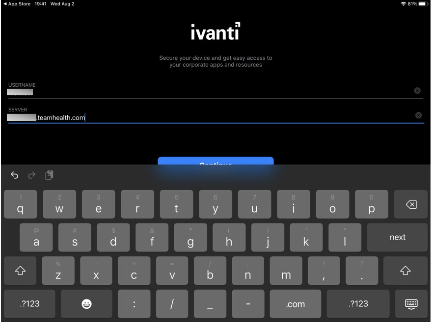 Step 10: In the Username field, enter your TeamHealth username and tap Next on the keypad to proceed.