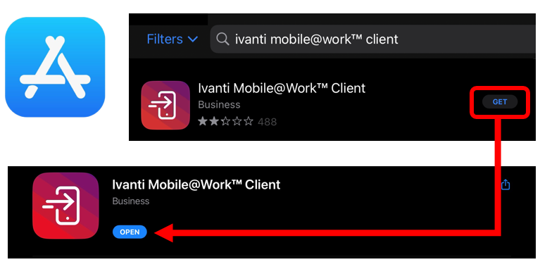 Open the App Store and enter “Ivanti Mobile@Work client” in the search bar. See screenshot below to confirm you have the correct application (white rectangle with an arrow on a red gradient) and tap GET, then Install when prompted. *If the app was previously installed, select the cloud symbol with the download arrow. When the app has completed installation, select Open to launch the app.