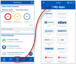 Step 3: Zenith will open to your Dashboard. Click My Apps from the left side-bar menu. All Application should appear in view , e.g. Qgenda, MIPS, Tableau.